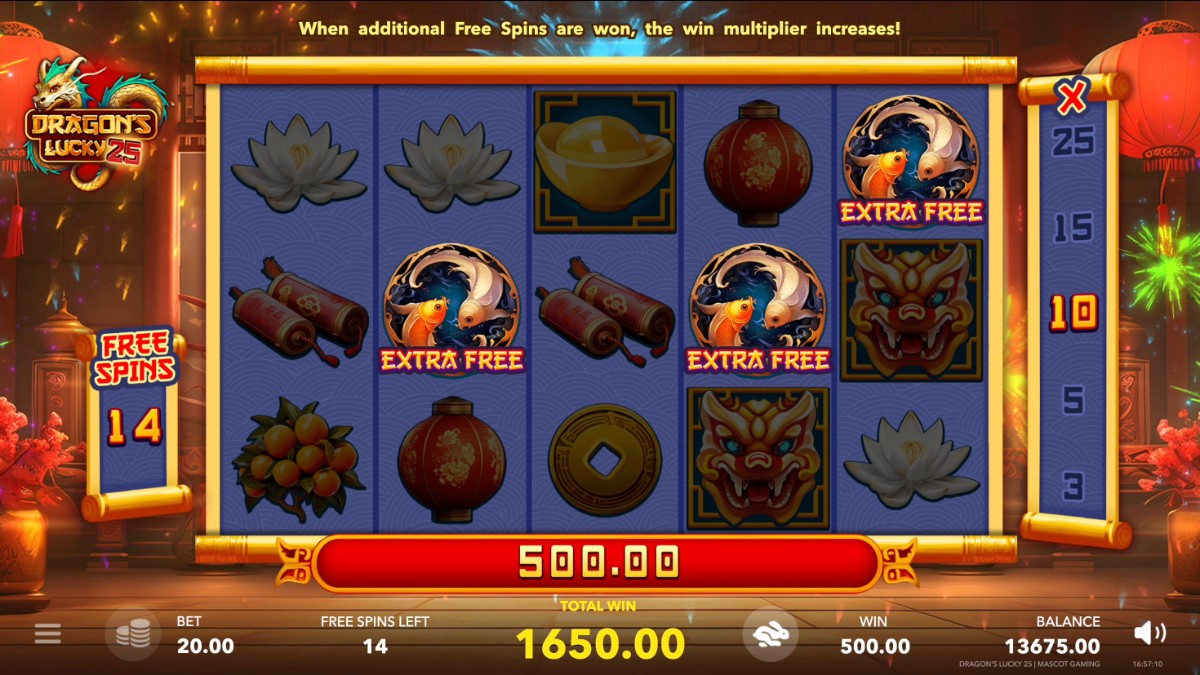 ‘Dragon's Lucky 25’ is a thrilling slot game with features designed to amplify the excitement with every spin. The game's Free Spins feature is a cornerstone of its gameplay; landing 3, 4, or 5 Scatter Symbols catapults players into a lucrative round of 10, 12, or 15 Free Spins, starting with a x3 multiplier to boost the winnings. The opportunity for retriggering is a compelling prospect—secure the same number of Scatters during the series, and you're rewarded with an additional set of spins.