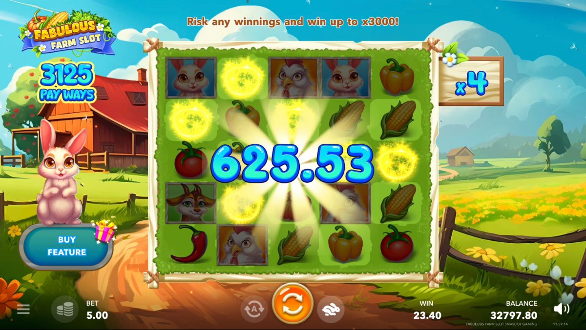 Fabulous Farm Slot features a 5-reel, 5-row layout with 3125 pay ways, providing ample opportunities for winning combinations. The game has a HIT rate of 23.8%, indicating frequent wins, and boasts high volatility, making it suitable for players who enjoy high-risk, high-reward gaming. The maximum payout is an impressive x18000 of the bet amount.