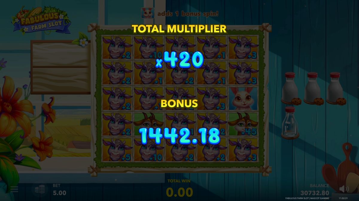 Activated by 4 Bonus symbols, the Bonus Game starts with 3 Bonus Spins, which can increase up to 5. During this feature, a cow and a goat symbols boost the total multiplier, a rooster activates win modifiers, and a rabbit adds extra spins.