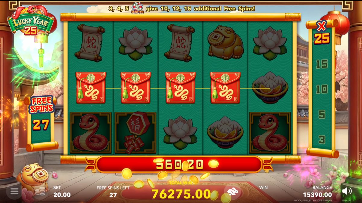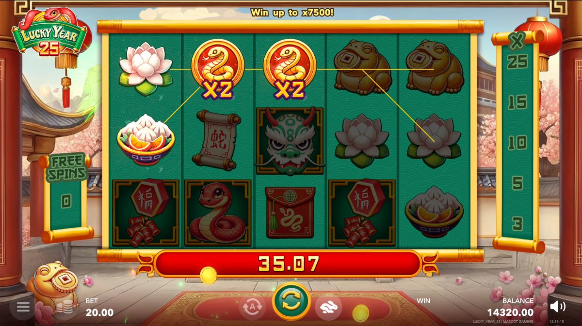 Lucky Year 25 is built on a 5-reel, 3-row layout with 20 paylines. Its HIT rate of 20.9% ensures a balance between frequent wins and suspenseful dry spells, making every spin count. With medium volatility, the game offers a mix of consistent payouts and exciting opportunities for bigger wins. The real highlight? A maximum win potential of x7500, making it an enticing choice for those who chase high rewards.