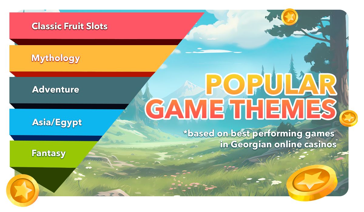 Georgian players prefer classic themes in slot games, such as fruit slots and mythology, while Ancient Egyptian themes rank lower, occupying only the fourth spot in popularity.