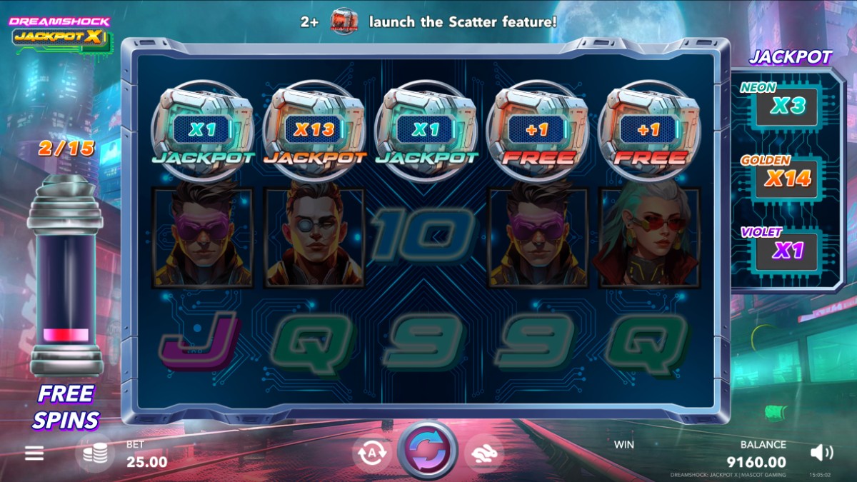 “DreamShock: Jackpot X” immerses players in a vibrant, neon-soaked cyberpunk world. The slot interface boasts an electric color scheme that resonates with the futuristic cityscape background. Mascot Gaming, as a top igaming software provider, offers a fully immersive experience - the slot game is set in a high-energy, high-tech urban environment.