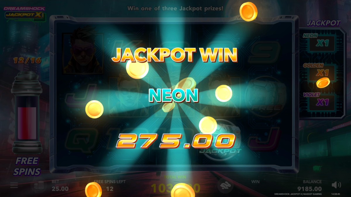 The game's main attraction, the Jackpot, comes in three flavors: Neon, Golden, and Violet. You'll collect multipliers in the base game, but these only pay out in Free Spins.