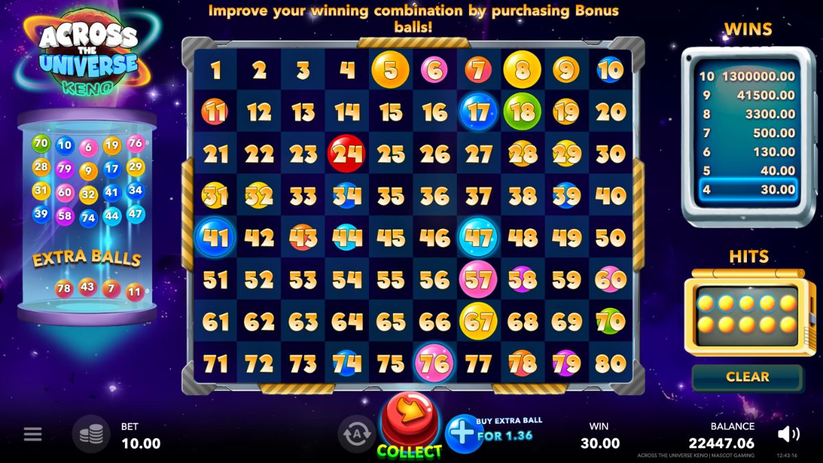 Across the Universe: Keno by Mascot Gaming is a standout addition to the world of online keno games. Its blend of traditional keno gameplay with innovative features like the Bonus Ball Feature offers a refreshing twist on the classic game. The high HIT rate, high volatility, and substantial maximum multiplier make it an attractive choice for both casual players and high rollers. Whether you're looking to enjoy a relaxing game or aiming for big wins, Across the Universe: Keno delivers a cosmic adventure that's worth exploring.
