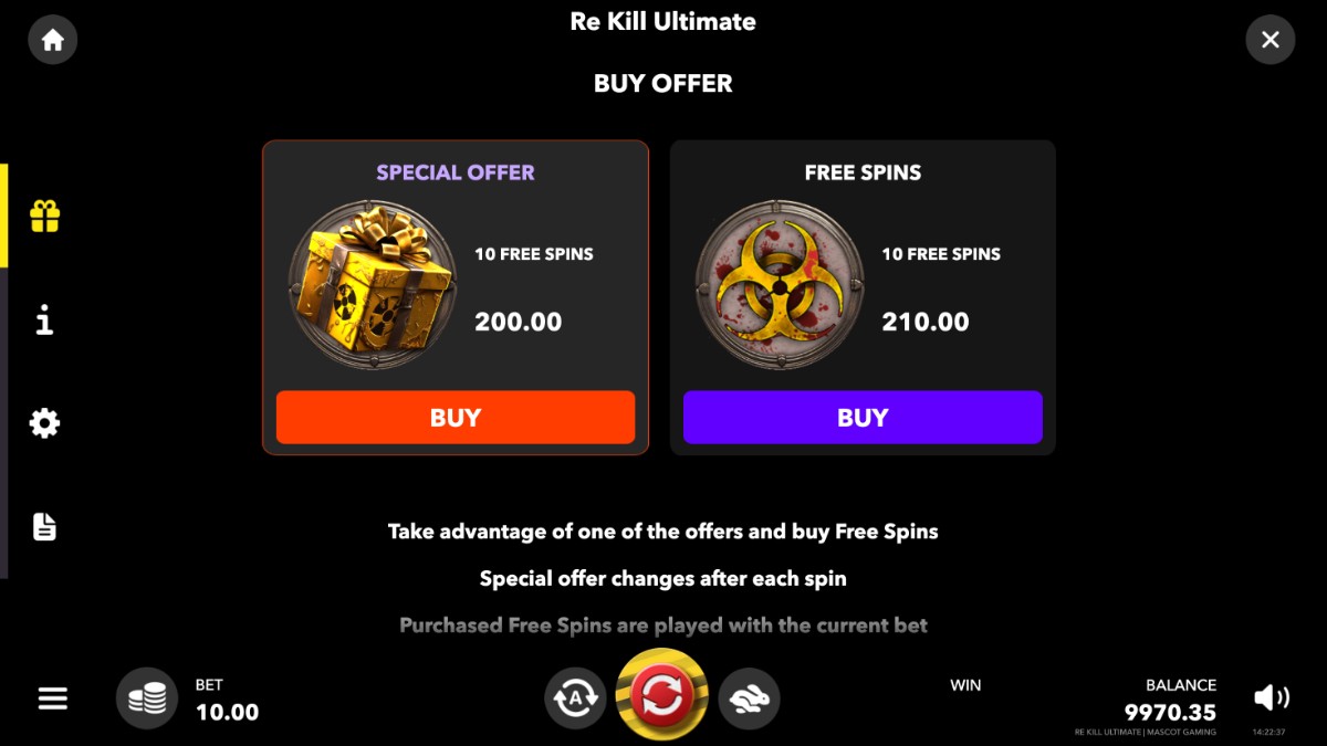 "Re:Kill Ultimate" offers the strategic 'Risk and Buy' option, where players can either buy their way into the Free Spins session at any time through a set offer or take a chance on a special random offer. This random option adds a layer of intrigue, as the price for Free Spins changes dynamically with each spin. For those who like to up the ante, the Risk game invites players to wager their winnings and spin a multi-tiered wheel. Each tier presents increasing multipliers, with the possibility to skyrocket winnings with a multiplier up to a staggering x1000 of the total bet.
