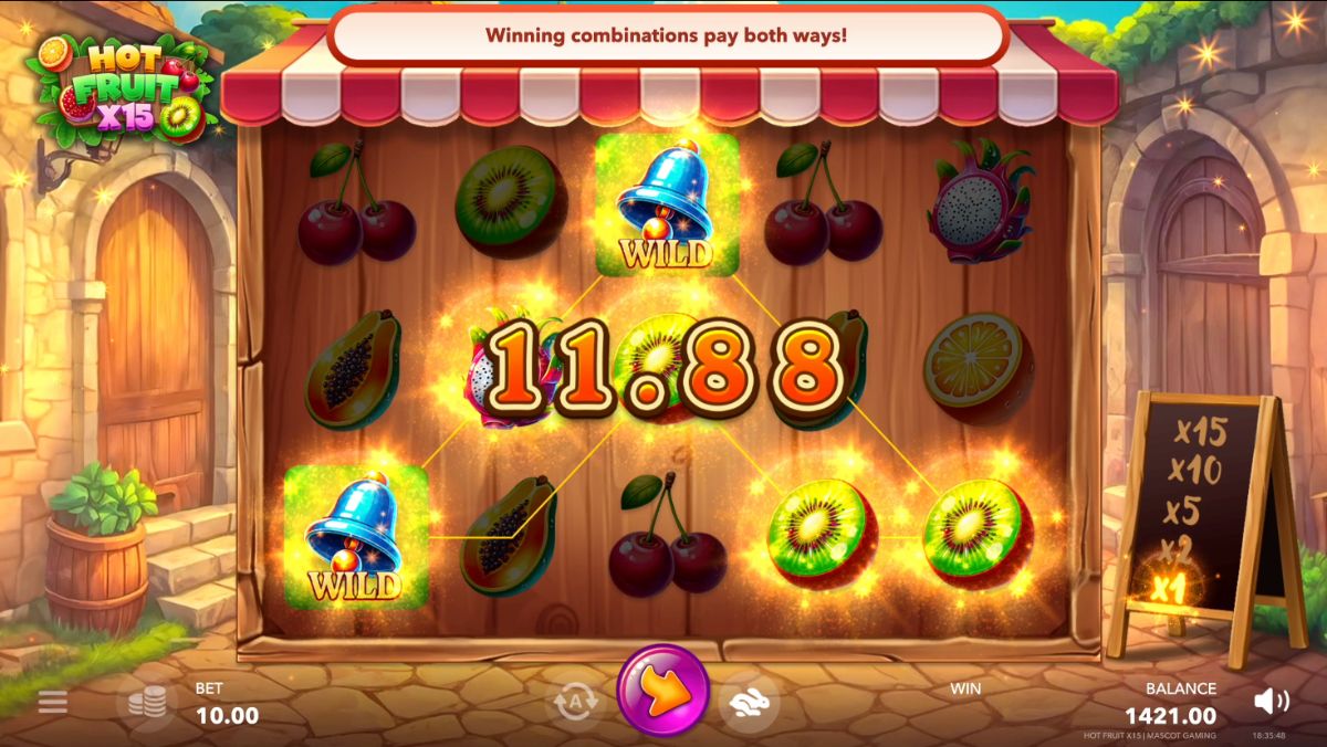 Hot Fruit X15 features a unique multiplier mechanic that enhances the excitement of each spin. With every winning spin, the multiplier increases: starting at x1, it progresses to x2, x5, x10, and finally peaks at x15. This feature significantly boosts the potential winnings, especially during streaks of consecutive wins.