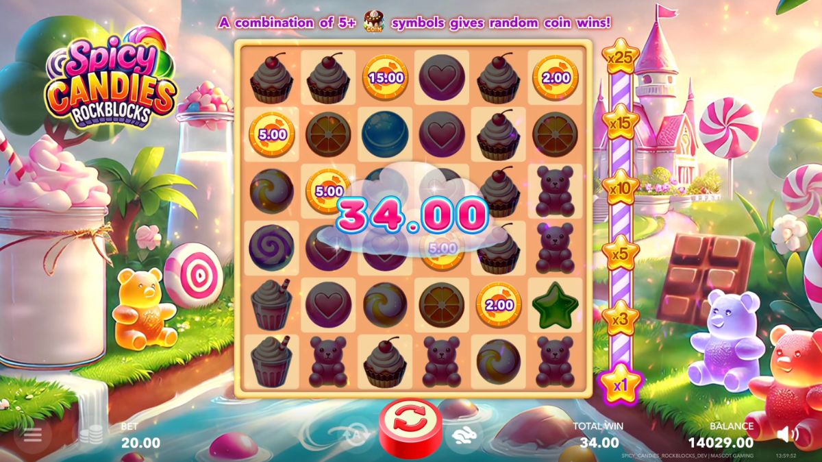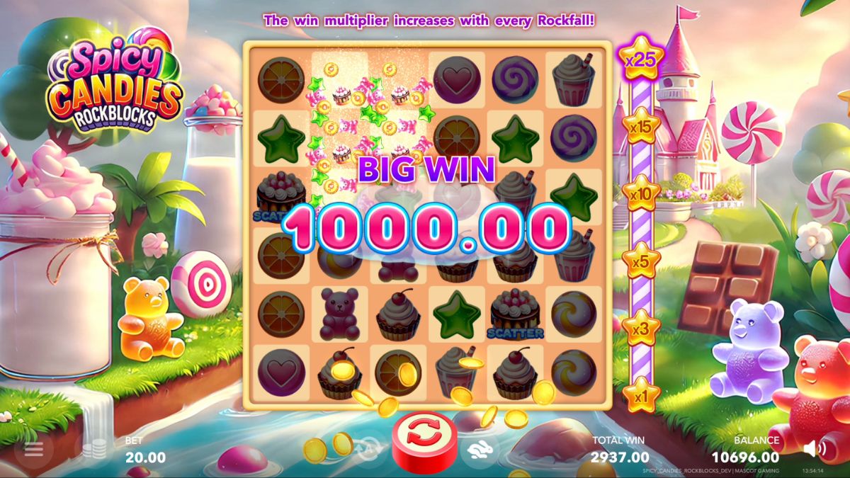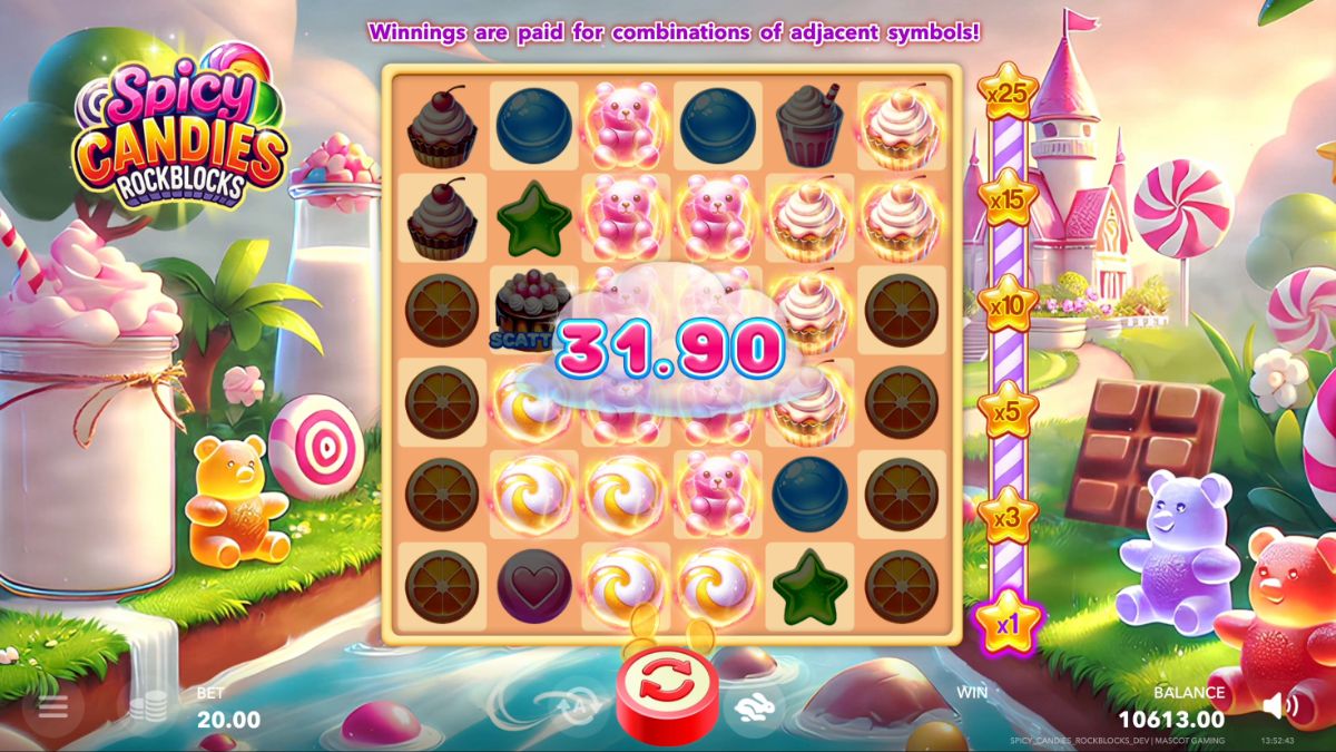 In Spicy Candies Rockblocks, each win activates the Rockfall Feature, removing winning symbols and allowing new ones to drop into place, potentially creating consecutive wins. With each successive Rockfall, the win multiplier increases, reaching up to x25.